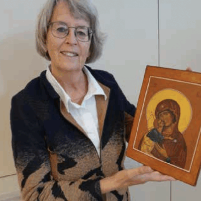 Marianne Vonkeman met icoon Moeder Gods van de tederheid.